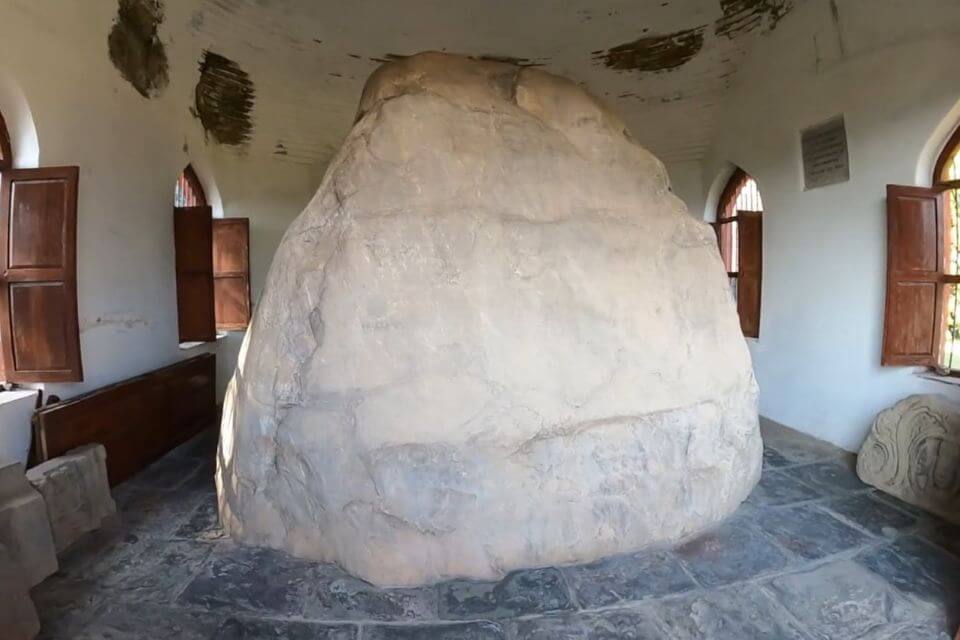 There is a pear-shaped crystal rock that contains the inscription of the fourteenth edict of emperor Ashoka. It is written in Pali language with Brahmi script.